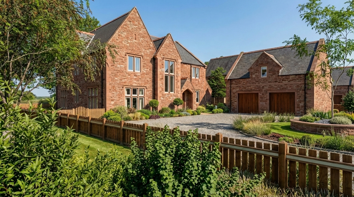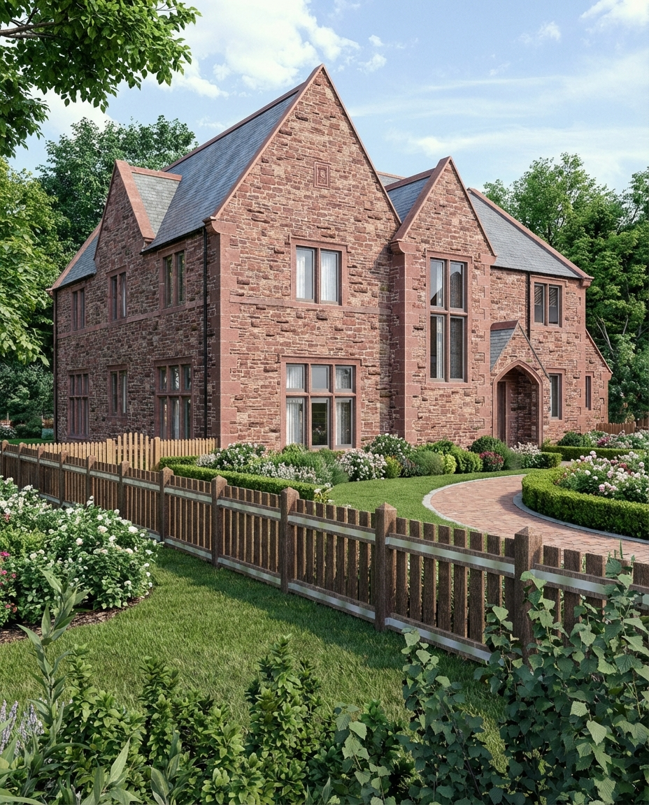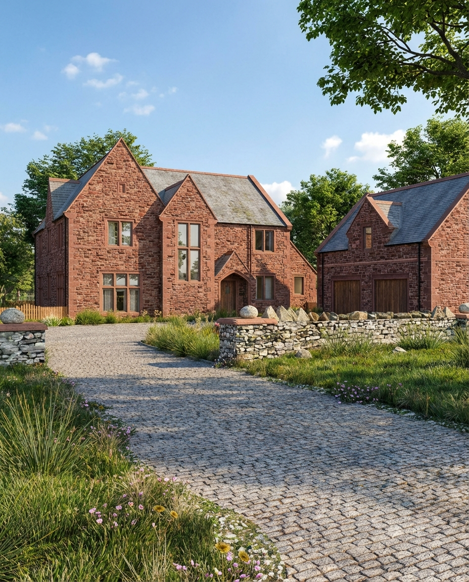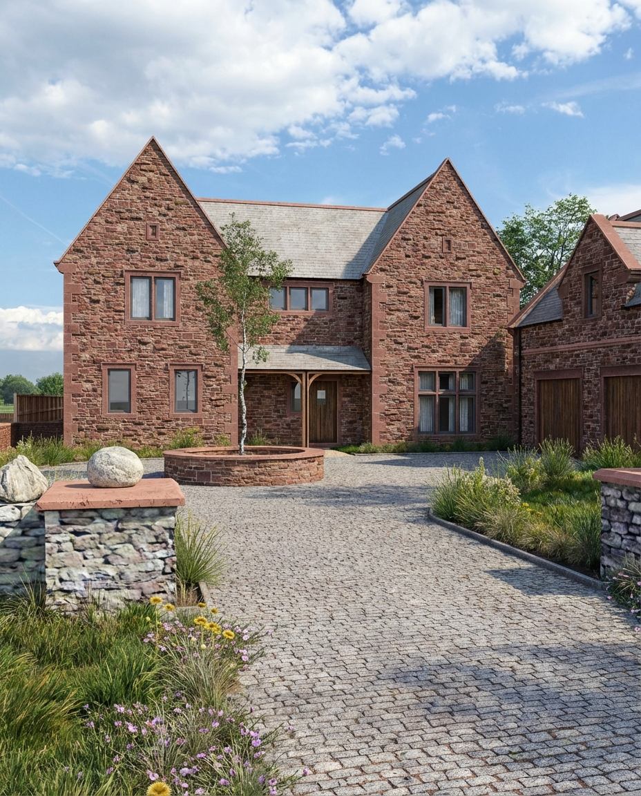 The architectural approach takes inspiration from the scale and presence of classical vicarages, simple, confident forms, pronounced gables and well-balanced proportions, reinterpreted to suit contemporary family living. Natural stone elevations and restrained detailing create a calm, enduring appearance, while large openings introduce light and connection to the surrounding landscape.